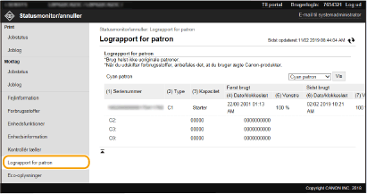 Papirformat og papirtype for papirkilde, modelnummer for tonerpatronen etc. vises. Du kan også klikke på [Kontrollér detaljer om forbrugsstoffer] på portalsiden (hovedsiden) for at få vist denne side (