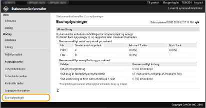 Den månedlige, samlede mængde udskrifter og månedlig, samlede strømforbrug bliver vist. Du kan få vist skærmen for eco-oplysninger og skifte indstillinger for at spare på papir og strømforbrug.