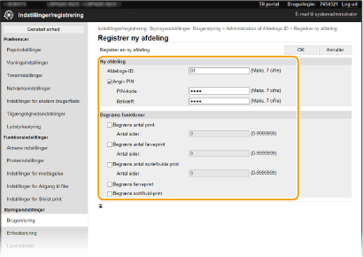 2 | Angiv de nødvendige indstillinger. [Afdelings-ID] Indtast nummeret for det afdelings-id, der skal registreres. [Angiv PIN] Angiv en pinkode ved at markere afkrydsningsfeltet og indtaste det samme tal både i tekstfelterne [PIN-kode] og [Bekræft]. [Begræns funktioner] Du kan begrænse antallet af udskrivningssider og de tilgængelige funktioner for de afdelinger, der skal registreres. For at begrænse antallet af sider, der skal udskrives, skal du vælge afkrydsningsfeltet for den ønskede type og indtaste det relevante antal sider i [Antal sider]. Vælg afkrydsningsfeltet for de ønskede funktioner for at begrænse dem. |