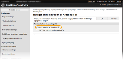 Marker afkrydsningsfeltet [Administration af Afdelings-ID].