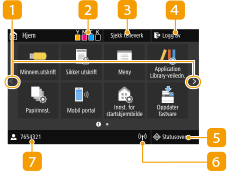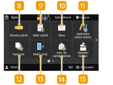 ![]() | <Minnem.utskrift>Skriver ut filer lagret på en USB-minneenhet. Skrive ut fra en USB-minneenhet (utskrift fra minnemedia) <Sikker utskrift>Bruk denne funksjonen til å skrive ut et sikret dokument. Skrive ut et dokument som er sikret med en PIN-kode (konfidensiell utskrift) <Meny><Funksjonsinnstillinger>, <Preferanser> og mange andre maskininnstillinger har utgangspunkt fra denne knappen. Innstillingsmenyliste Knapp for Application Library (Applikasjonsbibliotek)Du kan bruke disse knappene til å enkelt utføre en funksjon med ett trykk. Se bruksanvisningen for Application Library (Applikasjonsbibliotek) som finnes på nettstedet for bruksanvisninger. <Papirinnst.>Denne knappen brukes til å angi format og type for papiret som er lagt inn i papirskuffen og flerfunksjonsskuffen. Spesifisere papirformat og -type <Mobil portal>Bruk dette for å opprette en direkte trådløs tilkobling til en mobilenhet. Koble til med mobile enheter |