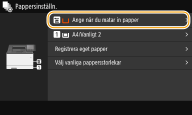 När du har registrerat standardpappersinställningar visas inställningsskärmen inte när du fyller på papper och samma inställningar används varje gång. Om du fyller på andra pappersformat eller papperstyper utan att ändra pappersinställningar blir utskrifterna kanske inte bra. För att undvika detta problem väljer du <Ange när du matar in papper> i steg 3 och fyller därefter på papper. |