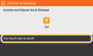 Meddelandet informerar dig om att tonerpatronen snart behöver bytas ut. Se till att ha en ny tonerpatron till hands. Byt tonerpatron om du ser det här meddelandet innan du ska börja skriva ut ett stort jobb. Det visas när <Åtgärd vid varning> är inställt på <Avbryt utskrift> (