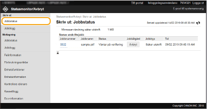 Du kan ta bort ett jobb genom att klicka på [Avbryt].