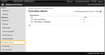 Information om enheten och systemansvarig visas. Enhetsnamnet och annan systemhanteringsinformation visas här enligt inställningarna i [Information för systemansvarig] på sidan [Användarhantering] eller i [Enhetsinfo-inställningar] på sidan [Enhetshantering].