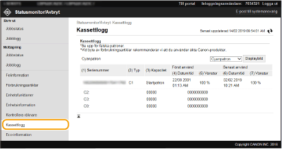 Papperskällans pappersformat och papperstyp, tonerpatronens modellnummer etc. visas. Du kan även klicka på [Kontrollera information om förbrukningsartiklar] på portalsidan (huvudsidan) för att visa den här sidan (