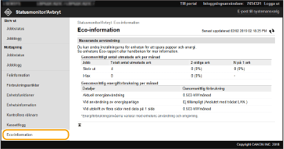 Totala utskriftsvolymen och energikonsumtionen per månad visas. Du kan öppna skärmen Eco-information och ändra inställningarna för att spara papper och energi.
