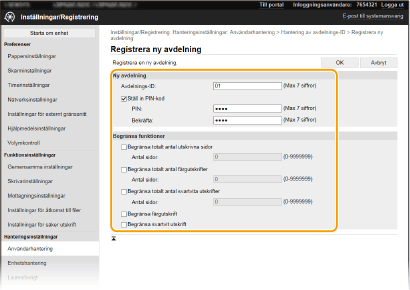 2 | Ange nödvändiga inställningar. [Avdelnings-ID] Ange ett avdelnings-ID som ska registreras. [Ställ in PIN-kod] När du vill ange en PIN-kod markerar du kryssrutan och anger samma siffror i både [PIN] och [Bekräfta]. [Begränsa funktioner] Du kan begränsa antalet sidor som får skrivas ut och tillgängliga funktioner för avdelningarna som registreras. Markera kryssrutan för avsedd typ när du vill begränsa antalet sidor som ska kunna skrivas ut och ange antalet sidor i [Antal sidor]. Markera kryssrutan för avsedda funktioner när du vill begränsa funktioner. |