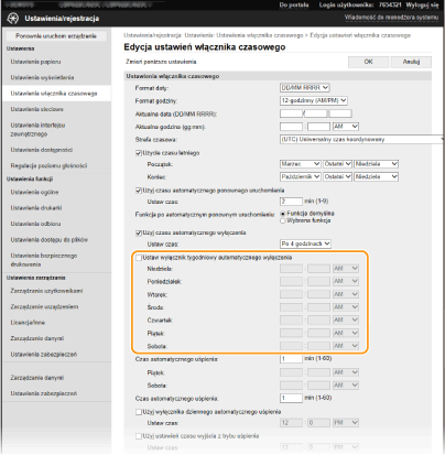 *Jeśli zasilania nie będzie można wyłączyć automatycznie w określonym czasie, zostanie podjęta ponowna próba maksymalnie dziesięć razy w 1-minutowych interwałach. Jeśli zasilania nie będzie można wyłączyć nawet po dziesięciu ponownych próbach, funkcja automatycznego wyłączenia nie będzie dostępna w tym dniu.