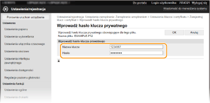 [Ustawienia klucza i certyfikatu] albo [Ustawienia certyfikatu CA].
