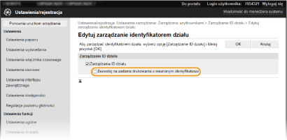 Włączanie funkcji Zarządzanie identyfikatorami wydziału w odniesieniu do zadań przesyłanych z komputera). Jednak jeśli przy tym ustawieniu jest zaznaczone pole wyboru, zadania są realizowane nawet bez wprowadzania identyfikatora i kodu PIN. Jeżeli chcesz tak skonfigurować ustawienie, aby realizacja zadań nie była możliwa, dopóki nie zostanie wprowadzony identyfikator wydziału i kod PIN, usuń zaznaczenie pola wyboru.