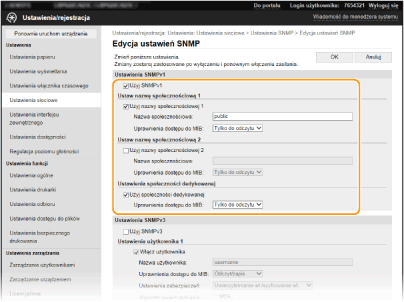 Jeśli włączone są obie wersje protokołu SNMP, zalecane jest wybranie w ustawieniach uprawnień dostępu do obiektów menedżera MIB dla protokołu SNMPv1 opcji [Tylko do odczytu]. Uprawnienia dostępu do obiektów menedżera MIB dla protokołów SNMPv1 i SNMPv3 można ustalać oddzielnie (a także osobno dla każdego użytkownika w przypadku protokołu SNMPv3). Wybranie opcji [Odczyt/zapis] (uprawnienie pełnego dostępu) dla protokołu SNMPv1 anuluje wydajne funkcje zabezpieczeń protokołu SNMPv3, ponieważ większością ustawień urządzenia można wtedy zarządzać za pomocą protokołu SNMPv1.