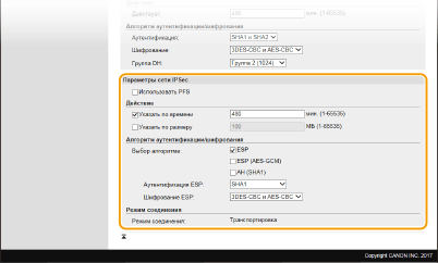 Отображается режим с установлением соединения IPSec. Аппарат поддерживает режим передачи, при котором шифруется полезная часть IP-пакета. Туннельный режим, при котором происходит инкапсуляция всего IP-пакета (заголовок и полезная часть), недоступен.