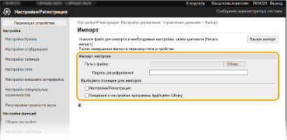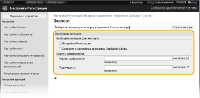 Данные параметров аппарата можно сохранить на компьютере (функция экспорта). Данные, сохраненные на компьютере, можно также зарегистрировать в аппарате (функция импорта). Данные, экспортированные из этого аппарата, можно импортировать на другой аппарат такой же модели. Это позволяет с легкостью копировать различные данные параметров на несколько аппаратов. Для использования этих функций необходимо войти в систему в режиме администратора. |