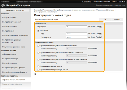 2 | Укажите необходимые параметры. [ИД отдела] Введите номер ИД отдела, который требуется зарегистрировать. [Задать PIN] Чтобы задать PIN-код, установите флажок и введите одинаковые числа в текстовые поля [PIN] и [Подтвердить]. [Ограничение функций] Можно ограничить количество печатаемых страниц и доступные функции для регистрируемых отделов. Чтобы ограничить количество печатаемых страниц, установите флажок для требуемого типа и введите соответствующее число страниц в поле [Количество страниц]. Установите флажок функций, использование которых требуется ограничить. |