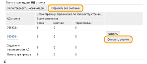 При необходимости обнулить счетчик страниц щелкните ссылку имени подразделения и затем щелкните [ИД отдела] и [Очистить счетчик]  [OK]. При необходимости сбросить счетчик страниц для всех имен подразделения щелкните [Сбросить все счетчики]  [OK]. |