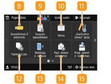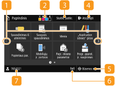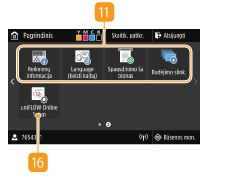 Paspauskite, jei norite patikrinti spausdinimo būseną, peržiūrėti naudojimo istoriją arba aparato tinklo parametrus, pvz., IP adresą. Taip pat galima patikrinti aparato būseną, pavyzdžiui, popieriaus likutį arba dažomųjų miltelių lygį kasetėse, arba peržiūrėti, ar neįvyko klaidų. Ekranas <Būsenos ekranas>