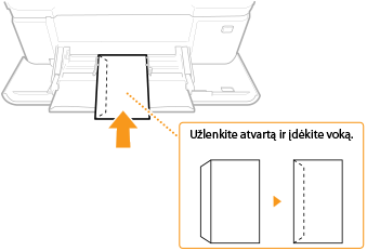 Šiame skyriuje aprašyta, kaip įdėti vokus norima kryptimi ir kokias procedūras reikia atlikti prieš dedant vokus. Bendrosios vokų įdėjimo į popieriaus stalčių arba universalųjį dėklą procedūros aprašą rasite skirsnyje Popieriaus įdėjimas į popieriaus stalčių arba Popieriaus dėjimas į universalųjį dėklą.
