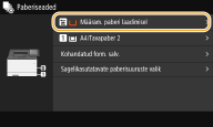 Pärast paberi vaikeseadete salvestamist ei kuvata paberi asetamisel paberi määramise kuva ja alati kasutatakse sama seadet. Kui asetate seadmesse muus formaadis või muud tüüpi paberi paberiseadeid muutmata, ei pruugi seade õigesti printida. Selle probleemi vältimiseks valige 3. juhises <Määram. paberi laadimisel> ja seejärel sisestage paber. |