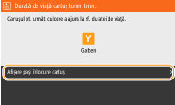 Dacă se afişează acest mesaj în timp ce este primit un fax prin Internet, aparatul nu imprimă ca să se evite imprimarea neclară. În schimb, datele primite se stochează în memorie. Pentru a continua imprimarea chiar dacă nivelul de toner rămas în cartuş este scăzut, setaţi <Cont. imp. cu niv.scăz. cart.> la <Pornit>. <Cont. imp. cu niv.scăz. cart.>