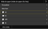 Si la pantalla que es mostra més amunt no apareix quan carregueu paper.Si sempre carregueu el mateix paper a la safata multiús, podeu ometre les operacions d'ajust del paper desant la mida i el tipus de paper com a opció predeterminada. No obstant això, quan es desa l'opció predeterminada, la pantalla que es mostra més amunt no apareix. Per visualitzar la pantalla, seleccioneu <Especificar en carregar paper> (Desament de les opcions de paper predeterminades per a la safata multiús).