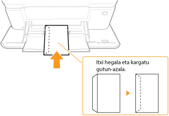 Atal honetan gutun-azalak nahi duzun orientazioarekin nola kargatu behar diren azaltzen da, eta gutun-azalak kargatu baino lehen jarraitu beharreko prozedurak ere bai. Gutun-azalak paper-tiraderan edo erabilera anitzeko erretiluan kargatzeko prozedura orokorraren deskribapen bat jasotzeko, ikusi Papera paper-tiraderan kargatzea edo Papera erabilera anitzeko erretiluan kargatzea.