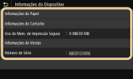 <Uso de Mem. de Impressão Segura>Exibe a quantidade de memória atualmente usada para armazenar dados de documentos protegidos.