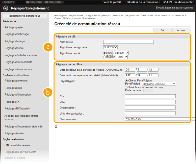 Il est possible de générer une clé avec certificat sur l'appareil lorsque celle-ci est nécessaire pour les communications cryptées via TLS (Transport Layer Security). Vous pouvez faire appel à TLS lors de l'accès à l'appareil depuis l'interface utilisateur distante. Des certificats auto-signés sont utilisés avec la clé avec certificat générée dans « Communication réseau ».