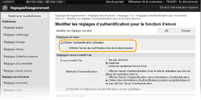 [Utiliser des informations d'authentification propres au périphérique et ne pas afficher l'écran d'authentification] | Aucun écran d'authentification ne s'affiche lorsque des e-mails ou des I-Fax sont envoyés. L'autorisation sur le serveur SMTP est effectuée à l'aide du nom d'utilisateur et du mot de passe configurés dans [Réglages E-mail/I-Fax] Définition des paramètres de communication par e-mail ou I-Fax. |