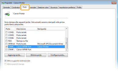 Se si utilizza una connessione di rete e si è modificato l'indirizzo IP della macchinaSe [Descrizione] per la porta selezionata è [Canon MFNP Port], e la macchina e il computer si trovano nella stessa subnet, allora la connessione verrà mantenuta. Non è necessario aggiungere una nuova porta. Se è impostato [Standard TCP/IP Port], è necessario aggiungere una nuova porta. Configurazione delle porte di stampa |