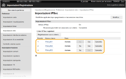 Prima di utilizzare IPSec per la comunicazione crittografata è necessario registrare i criteri di protezione (SP). Un criterio di protezione è costituito dal gruppo di impostazioni descritte di seguito. Dopo la registrazione dei criteri, specificare l'ordine con cui sono applicati.