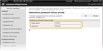 Immettere dei caratteri alfanumerici per la password della chiave privata impostata per il file da registrare.