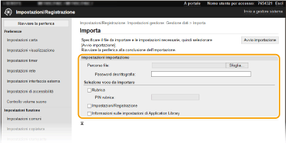 Caricare (importare) i dati esportati dalla macchina. È inoltre possibile importare le impostazioni della macchina da un'altra macchina sulla macchina in uso, purché il modello sia lo stesso.