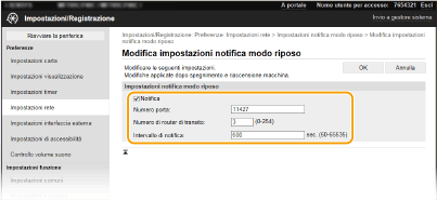 2 | Selezionare la casella di controllo [Notifica] e specificare le impostazioni richieste. ![]() [Notifica] Selezionare la casella di controllo per informare il software di gestione dei dispositivi sullo stato di alimentazione della macchina. Quando viene selezionato [Notifica] la macchina eviterà comunicazioni non necessarie nella modalità riposo e ridurrà il consumo totale di energia. [Numero porta] Modificare il numero di porta per questa funzione in base all'ambiente di rete. [Numero di router di transito] Specificare il numero di router che i pacchetti di notifica possono attraversare. [Intervallo di notifica] Specificare la frequenza delle notifiche relative allo stato alimentazione del software di gestione periferiche. |