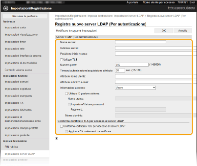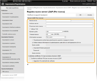 La registrazione del server LDAP deve essere effettuata separatamente per la ricerca e l'autenticazione. Per utilizzare un server LDAP per la ricerca di destinazioni fax ed e-mail, registrarlo per la ricerca, mentre per utilizzarlo per l'autenticazione nell'invio di e-mail o fax, registrarlo per l'autenticazione.