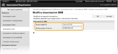 Il nome del gruppo di lavoro è un nome per il raggruppamento di più computer in modo che le funzioni di rete di base, come la condivisione di file, diventino disponibili in una rete Windows. Specificare il nome del gruppo di lavoro per identificare il gruppo a cui appartiene la macchina.