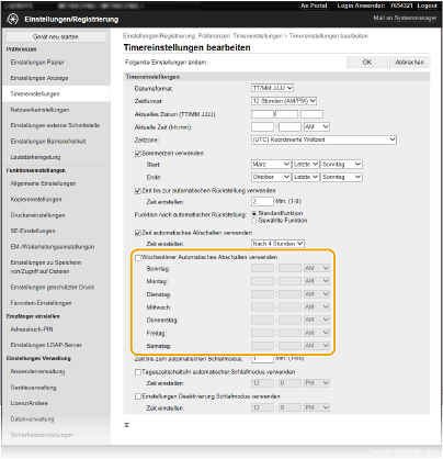 Aktivieren Sie das Kontrollkästchen [Wochentimer Automatisches Abschalten verwenden], und stellen Sie die Zeit zum Ausschalten der Stromversorgung ein.
