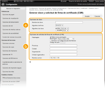 Cuando [SHA384] o [SHA512] están seleccionados en [Algoritmo de firma], [512 bits] no podrá seleccionarse como longitud de clave si está seleccionado [RSA] en [Algoritmo de clave].