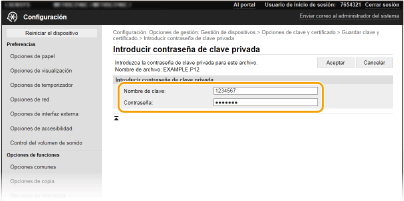 Introduzca caracteres alfanuméricos para la contraseña de la clave privada establecida en el archivo que va a registrar.