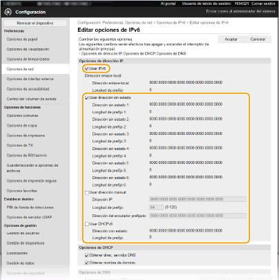 Seleccione la casilla de verificación cuando utilice una dirección con estado. Cuando no utilice DHCPv6, quite la marca de la casilla de verificación.