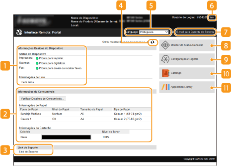 Quando inicia sessão na UI Remota, aparece a seguinte página do portal. Esta secção descreve os itens apresentados na página do portal e as operações básicas.