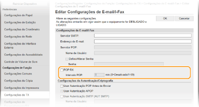 Esta opção define o intervalo (em minutos) utilizado para estabelecer a ligação automática ao servidor POP3. Quaisquer documentos I-Fax existentes no servidor são automaticamente recebidos e impressos.