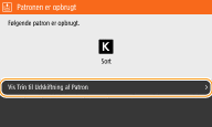 Denne meddelelse giver dig besked om, at en tonerpatron snart skal udskiftes. Sørg for, at du har en ny tonerpatron klar. Udskift tonerpatronen, hvis denne meddelelse vises før påbegyndelsen af et stort udskriftsjob. Den vises, hvis <Handling ved advarsel> er indstillet til <Stop udskrivning> (