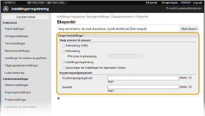 Indtast en adgangskode for at kryptere eksportdata ved hjælp af alfanumeriske tegn. Indtast den samme adgangskode i [Bekræft]. Hvis afkrydsningsfeltet [Adressebog] eller [Indstillinger/registrering] er valgt, skal du indstille en krypteringsadgangskode for at kunne eksportere dataene.