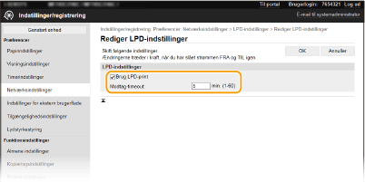2 | Rediger indstillingerne efter behov. ![]() [Brug LPD-print] Marker afkrydsningsfeltet for at udskrive via LPD. Hvis du ikke bruger LPD-udskrivning, skal du fjerne markeringen i afkrydsningsfeltet. [Brug RAW-print] Marker afkrydsningsfeltet for at udskrive via RAW. Hvis du ikke bruger RAW-udskrivning, skal du fjerne markeringen i afkrydsningsfeltet. [Modtag-timeout] Indstil en værdi som ventetid for genstart for datamodtagelse. Hvis datamodtagelse ikke genoptages inden for den angivne tid, annulleres udskrivningen. |