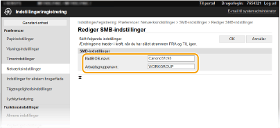 | | SMB (Server Message Block) er en protokol til deling af ressourcer, f.eks. filer og printere, hvor der er flere end én enhed på et netværk. Maskinen anvender SMB til at gemme scannede dokumenter i en fælles mappe. Afhængigt af dit netværk kan det være nødvendigt at angive NetBIOS-navn og arbejdsgruppenavn. |