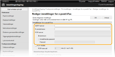 Bruk Fjernkontroll til å konfigurere detaljerte innstillinger for sending og mottak, som for eksempel innstillinger for bruk av maskinen for å sende og motta I-fakser i tillegg til POP-godkjenning og kryptering av kommunikasjon før du sender e-poster eller I-fakser. Kontakt operatøren eller nettverksansvarlig for de nødvendige innstillingene.