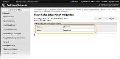 A készülékkel használni kívánt kulcs és tanúsítvány, valamint a hitelesítésszolgáltatói tanúsítvány a hitelesítésszolgáltatótól szerezhetők be. Telepítse és regisztrálja a készülékkel használni kívánt, korábban már beszerzett kulcsot és a tanúsítványfájlt, valamint a hitelesítésszolgáltatói tanúsítványfájlt a Távoli felhasználói felületet segítségével. Már előre ellenőrizze, hogy milyen feltételek megléte szükséges a készüléken a kulcs és a tanúsítvány, valamint a hitelesítésszolgáltatói tanúsítvány használatához (Kezelési funkciók).