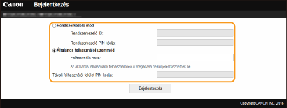 A Távoli felhasználói felület összes művelete és beállítása elérhető. Adja meg a megfelelő azonosítót a [Rendszerkezelő ID] mezőben, valamint a PIN-kódot a [Rendszerkezelő PIN-kódja] mezőben. A rendszerkezelői azonosító és PIN-kód beállítása