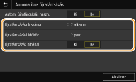 Válassza a <Be> lehetőséget az <Autom. újratárcsázás haszn.> pontnál